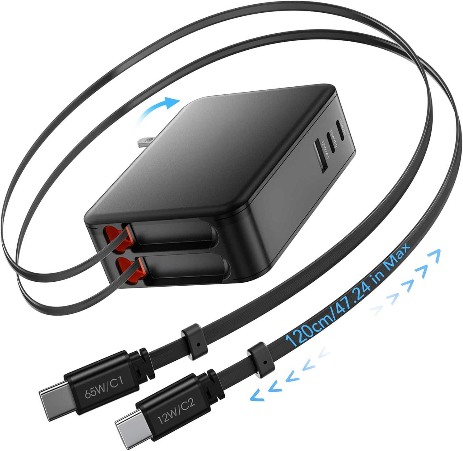 65W for MacBook Pro Charger,5-in-1 Retractable Wall Charger Plug for iPhone 17, Dual 3.94 ft PD USB C Cable&3 Ports, Fast Charging Block for Mac Book Pro/Air, M1 M2 M3 M4, iPad Pro,Galaxy,Pixel
