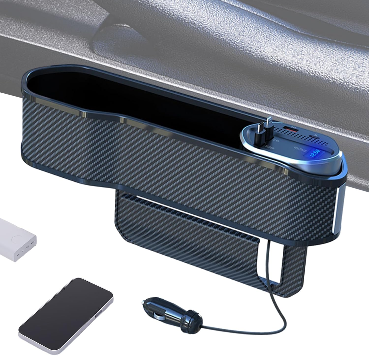 Car Seat Gap Filler Organizer with Wireless Charger,2 USB Ports and 2 Retractable Charging Cable of Type C, iOS, Multifunctional Storage Box with Cup Holder Cigarette Lighter Quick Charge